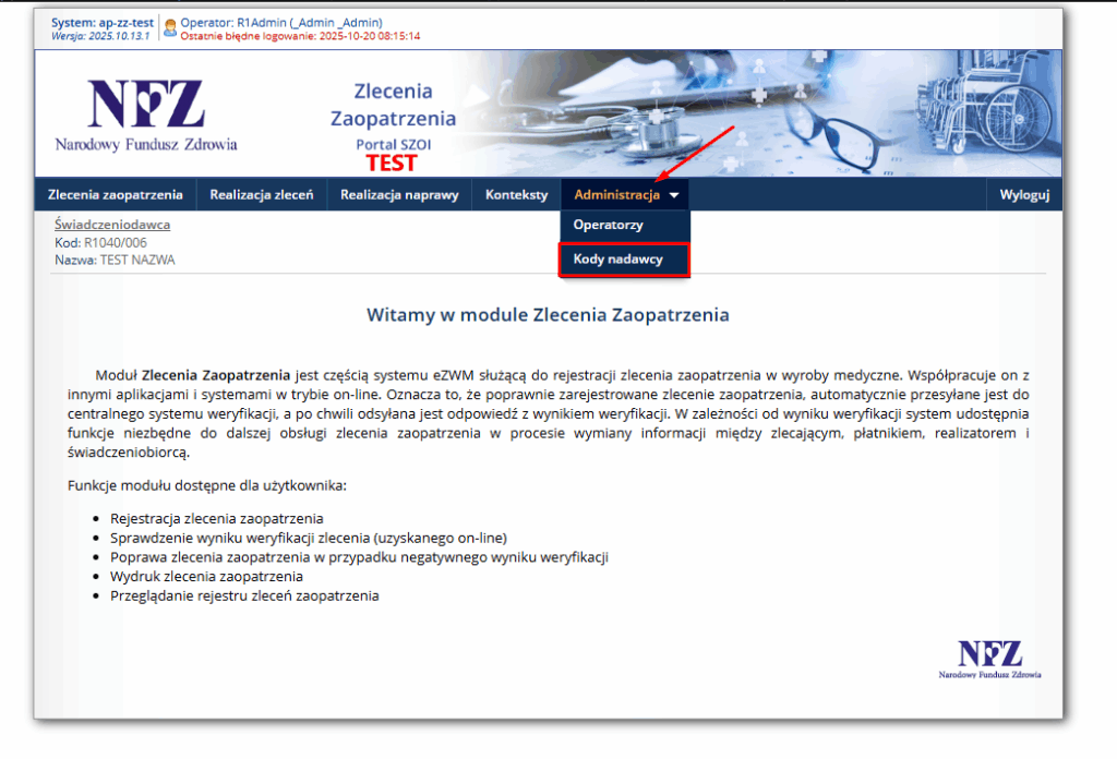 • Strona EZWM NFZ – jeśli masz dostęp jako podmiot (nie jako praktyka). Kod dostępny jest tuż po zalogowaniu, w informacji o świadczeniodawcy.
