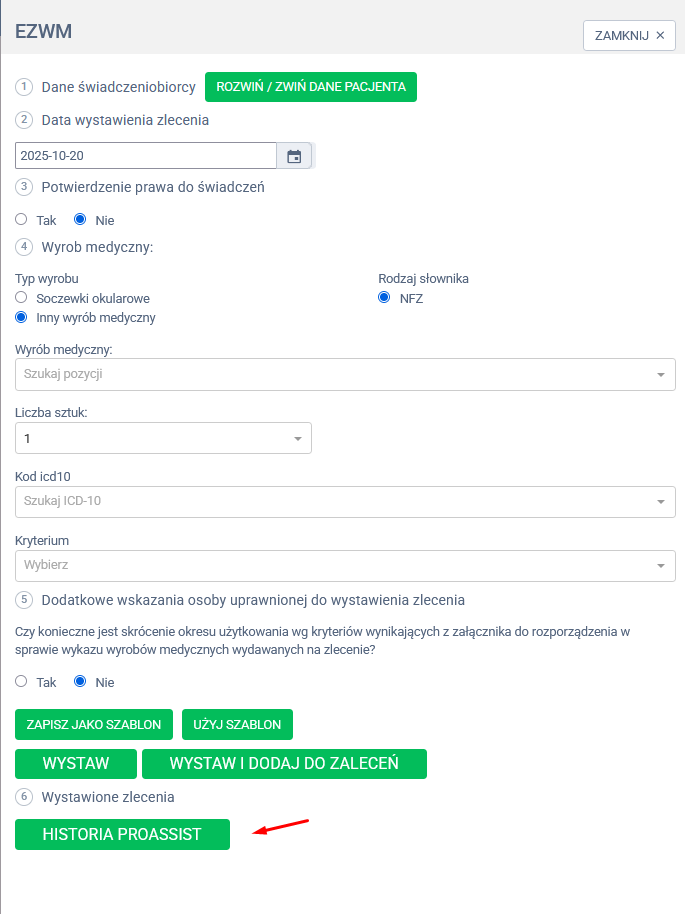 Na dole formularza znajduje się również sekcja z historią wcześniej wystawionych zleceń EZWM dla tego pacjenta w ramach oprogramowania Proassist. Dzięki temu masz wgląd w wszystkie zlecenia wydane w placówce. Z widoku historii możesz wydrukować zlecenie za pomocą ikony drukarki lub powielić do nowego formularza.