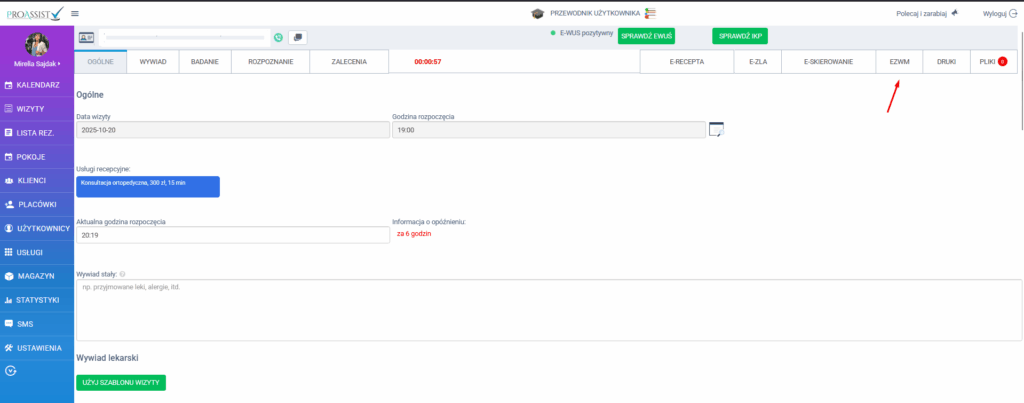 2. Kliknij zakładkę „EZWM”, znajdującą się w panelu wizyty.