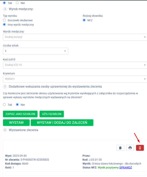– przypadku wybrania innego wyrobu: określ rodzaj wyrobu, podaj liczbę sztuk, wybierz odpowiedni kod ICD-10 z listy rozwijanej, następnie określ kryterium medyczne, również wybierając je z dostępnej listy.
