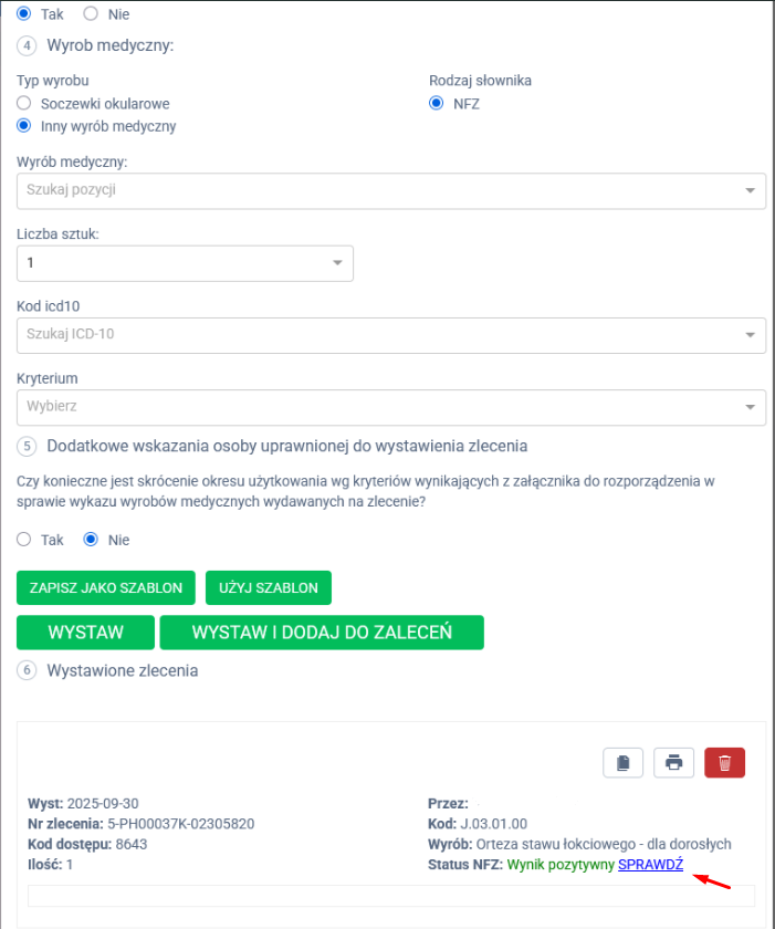 3. Przy wystawionym zleceniu znajdziesz opcję „Sprawdź” – kliknij ją, aby uzyskać aktualny status z NFZ. Po kliknięciu pojawi się odpowiedni status.