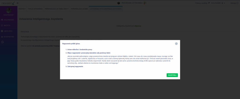 „Hej Proassist, zapisz rozpoznanie: [nazwa szablonu]”