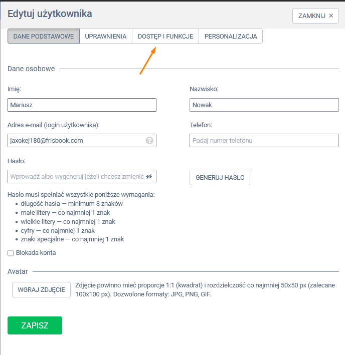 W kolejnym kroku przejdź do zakładki Dostęp i funkcje.
