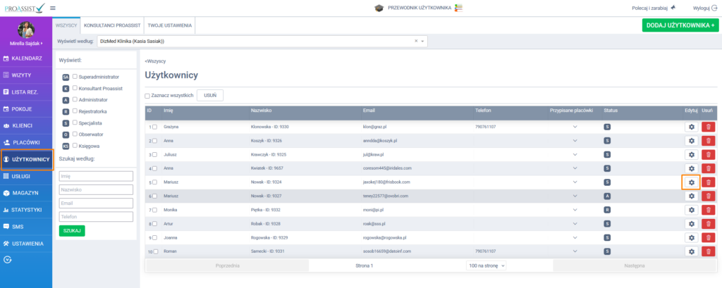 Aby włączyć logowanie dwuskładnikowe (2FA) w systemie Proassist, zaloguj się na konto administratora i z bocznego menu przejdź do zakładki Użytkownicy. Wybierz użytkownika, którego chcesz objąć 2FA, kliknij Edycja użytkownika.
