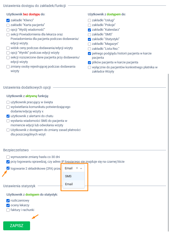 W sekcji Bezpieczeństwo zaznacz checkbox przy opcji Logowanie 2-składnikowe (2FA) przez i wybierz preferowaną metodę — e-mail lub SMS. Zapisz wprowadzone zmiany.