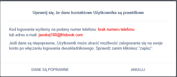 Podczas włączania system wyświetli komunikat w formie popup, informujący: „Upewnij się, że dane kontaktowe użytkownika są prawidłowe”. Potwierdź, że jego dane są aktualne i poprawne, lub anuluj operację i wprowadź zmiany przed włączeniem wybranej metody.
