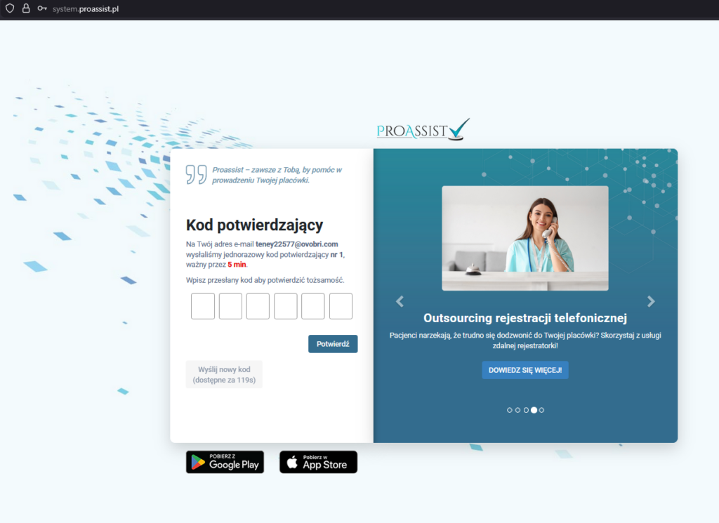 Po włączeniu logowania dwuskładnikowego (2FA) w systemie Proassist, przy każdej próbie logowania użytkownik będzie proszony o wprowadzenie kodu 2FA, który jest ważny przez 5 minut.