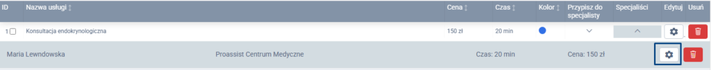 Kliknij Edycja przy specjaliście, dla którego chcesz wprowadzić dodatkowe informacje do usługi.