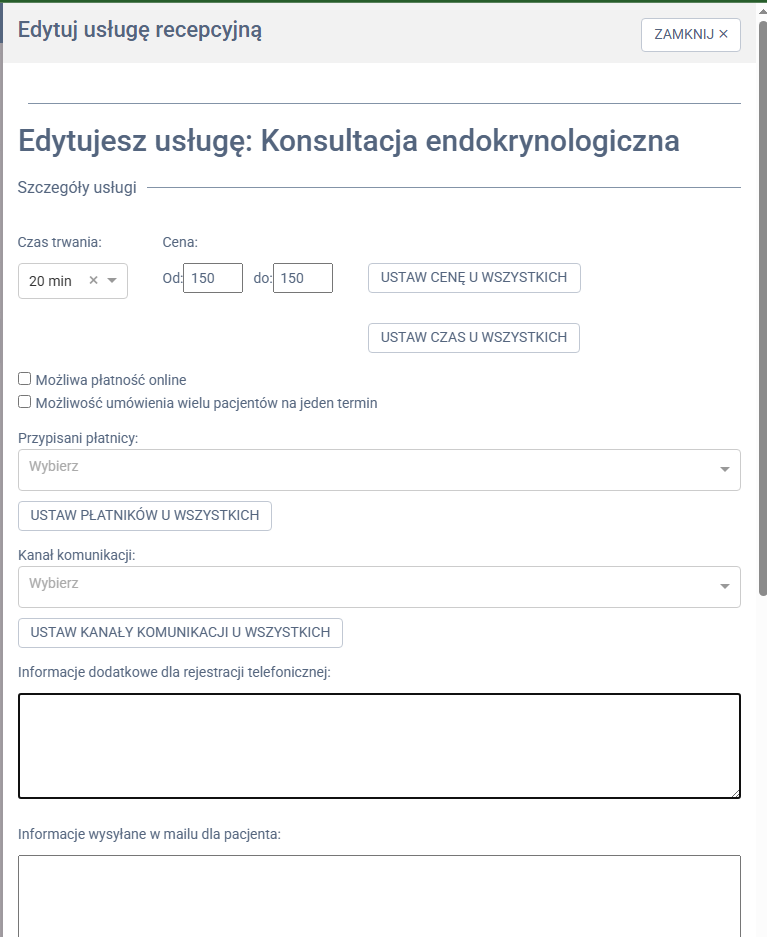 Edycji ceny usługi – wpisujemy aktualną cenę, którą pacjent będzie widział przy rezerwacji wizyty.