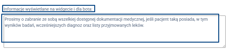 Są to informacje, które pacjent powinien znać przed wizytą, np. wymagania dotyczące wcześniejszego przygotowania do badania, zalecenia przed konsultacją czy konieczność przyniesienia dokumentacji medycznej. Informacje te będą widoczne przy zapisie na wizytę i pomagają pacjentowi odpowiednio przygotować się do konsultacji.