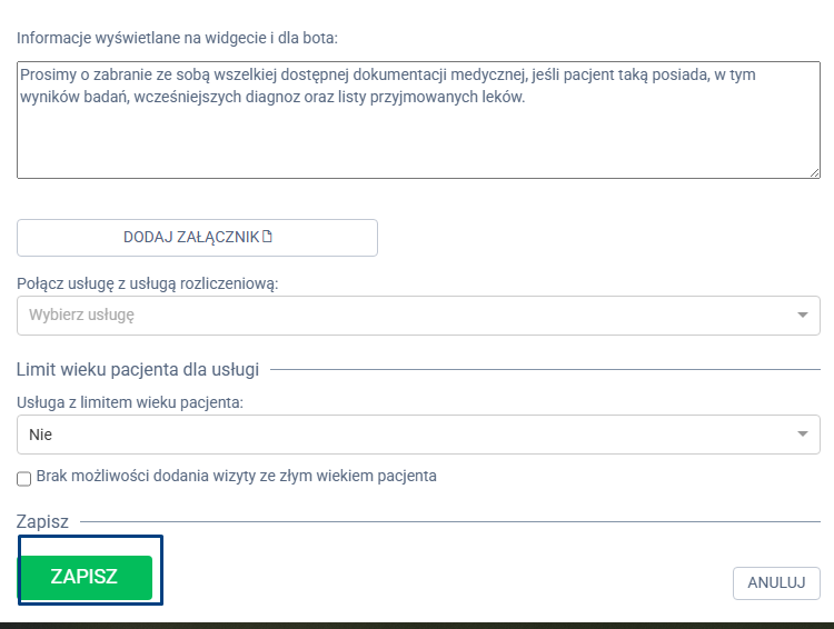 Po wprowadzeniu wszystkich informacji dotyczących usługi, aby zatwierdzić zmiany, klikamy w lewym rogu przycisk ZAPISZ. W ten sposób wszystkie wprowadzone informacje zostaną zapisane i zaktualizowane w bazie wiedzy chatbota.