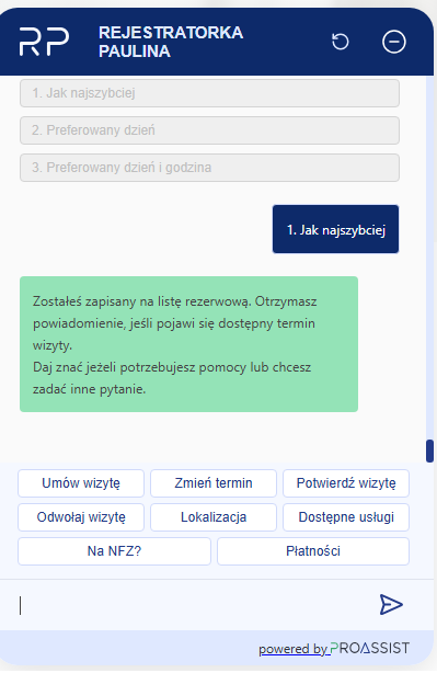 Dzięki temu pacjenci będą mogli korzystać z opcji wpisania się na listę rezerwową, a chatbot będzie informował o tej możliwości w odpowiedzi na pytania o dostępne terminy.
