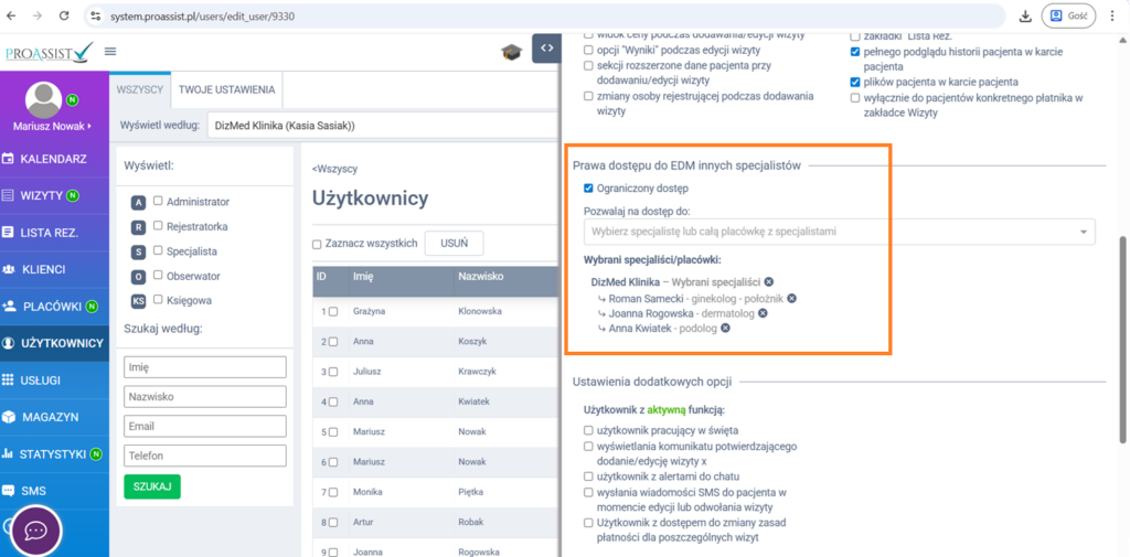 W takich sytuacjach można ustawić ograniczony dostęp do EDM innych specjalistów dla wybranego użytkownika.