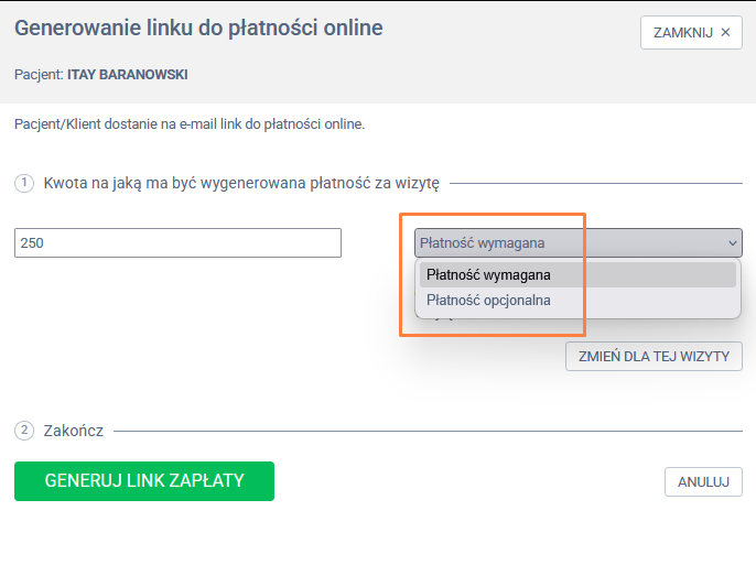 Następnie w panelu bocznym wysuwanym kliknij zielony przycisk GENERUJ LINK ZAPŁATY. System automatycznie podpowiada kwotę zapłaty jako kwota za daną usługę. W każdej chwili możesz dokonać edycji tej ceny, wpisując odpowiednie cyfry. Dodatkowo możesz zdefiniować, czy płatność ma być wymagana czy możliwa. Po kliknięciu w zieloną zakładkę GENERUJ LINK ZAPŁATY link do płatności on-line zostaje przesłany do pacjenta drogą e-mail na wskazany adres e-mail w karcie pacjenta.