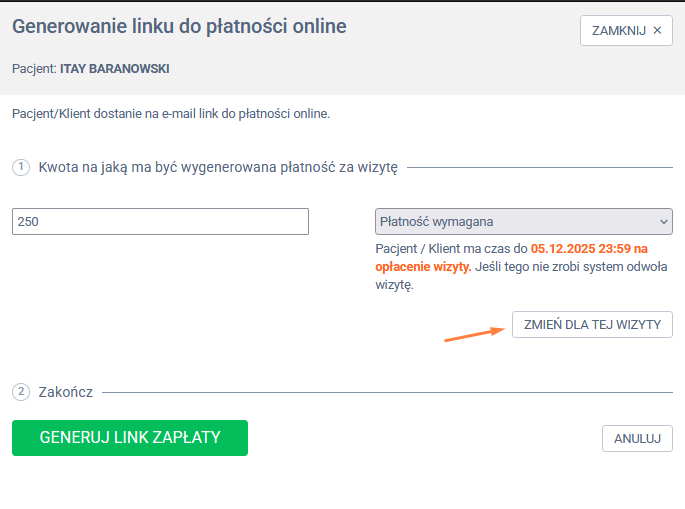 💡Jeśli wizyta odbywa się dzisiaj (np. o godz. 19:00), termin płatności zostaje automatycznie ustawiony do godziny wizyty (czyli np. do 19:00).