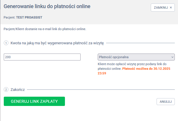 - Termin płatności przy generowaniu linku jest ustalany automatycznie na podstawie konfiguracji płatności dla danej wizyty: