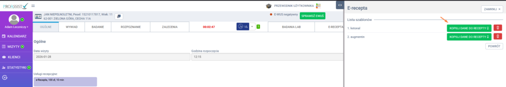 Z listy dostępnych szablonów wybierz odpowiedni szablon recepty. Kliknij „Kopiuj dane do recepty”.