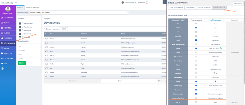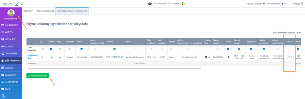 5. Zaznacz checkbox przy ICD-10, aby kolumna była widoczna w tabeli wizyt tego użytkownika.