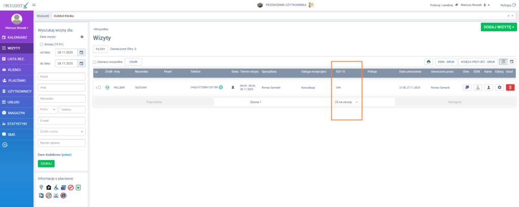 – wyszukiwać wizyty według konkretnych kodów ICD-10,