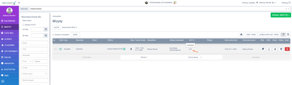 Wyświetlanie i filtrowanie procedur ICD-10 na liście wizyt #